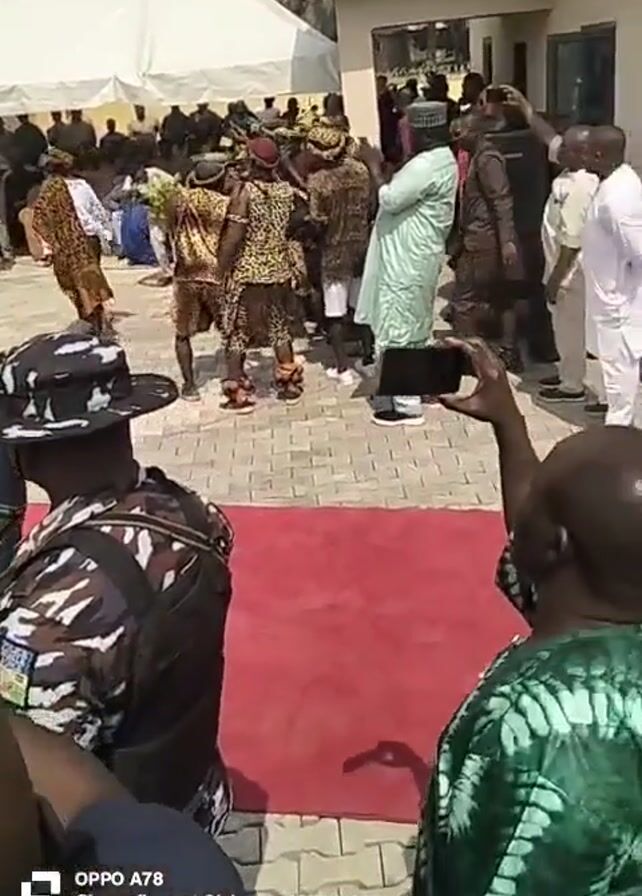 crowd of people gathered outdoors, many under a white tent. A group of men in leopard print outfits are dancing in front of the crowd. Several people are holding up phones to record the scene. In the foreground, a man wearing a camouflage hat and vest is standing with a rifle slung over his shoulder. A red carpet is visible on the ground in front of the crowd. The environment appears to be sunny and festive. The date and time stamp on the bottom of the screen reads: 24 January 2026 at 11:48.