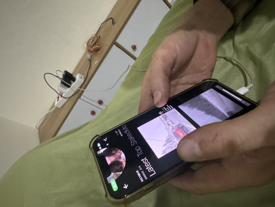 This image depicts a close-up view of an individual's hands holding an iPhone in Cam Đức, Vietnam. The phone, encased in a translucent amber-colored protective cover, is displaying a dark-themed application titled "Latest Top StakedMo." A smaller picture-in-picture window at the top left shows two individuals. Below the title, the text "VICTORIA RANKED #79" is visible. The screen displays two landscape images or video thumbnails: the upper one shows a snowy road with a red car and other vehicles, while the lower one depicts a snowy landscape. A white charging cable is plugged into the bottom of the phone. The hands are resting on a light green fabric surface, likely a bed or blanket. In the background, a light wood-grained surface, possibly a nightstand or dresser, is visible, featuring white drawers with small red circular knobs. On this surface, a white power strip with multiple plugs and black cables connected to it, including a black charger and a white USB power adapter, is present. A loosely coiled copper-colored wire is also on the surface, connected to a black cable. The wall behind is a plain, light color.
