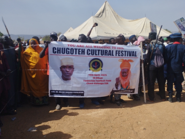 large group of people standing in front of a white banner with the words "You Are All Welcome To 29th Chugoteh Cultural Festival" written on it. The banner also displays a picture of two men in traditional attire, one in a hat and the other with a beard. The men are standing in front of a tent, which is in the background of the image. The people in the image are dressed in casual clothing and are holding a variety of items, including sticks and banners. The image appears to have been taken in an outdoor setting, likely in a field or a park. The event is scheduled for 19th April, 2023 at 10:00 am at the Township Football Field in Cham Balanga LGA, Nigeria. The coordinates provided place this event in the village of Chugoteh, near the town of Cham Balanga.