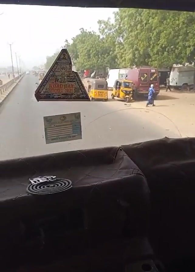 From inside a vehicle, a view through the windshield shows a wide road with a central median barrier. The road is lined with buildings, trees, and lampposts. Traffic, including cars, motorcycles, and auto rickshaws, moves along the road. A "Road Tax Sticker 2025" is visible on the windshield. The vehicle appears to be in motion. The dashboard and steering wheel are visible. The sky is overcast, giving the scene a hazy appearance.