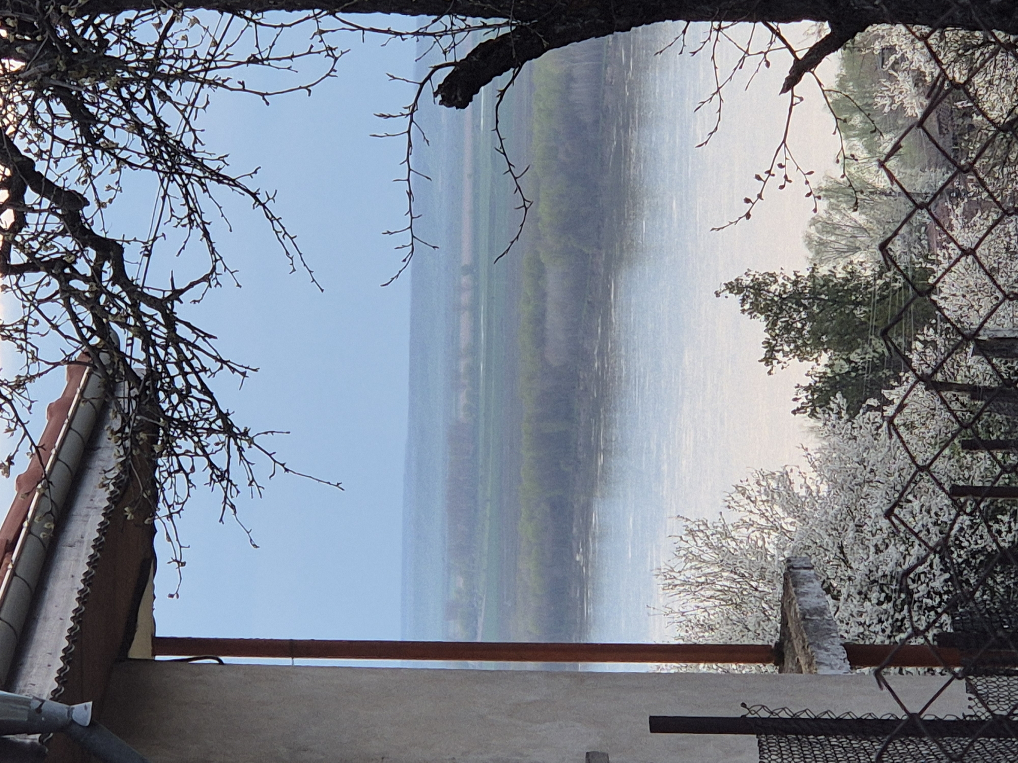 The image, taken in Tutrakan, Bulgaria, appears to be oriented upside down. It shows a partial view from what seems to be an elevated position, possibly a balcony or window. The foreground includes sections of a building's architectural elements: a roof, gutter, and a concrete wall with a horizontal iron bar. Parts of bare tree branches frame the left side, and a chain-link fence with flowering trees is visible on the right. In the distant background, a horizontal band of hazy landscape is observed, which includes the Danube river, along with fields and wooded areas. The sky occupies the upper part of the image and is light blue.