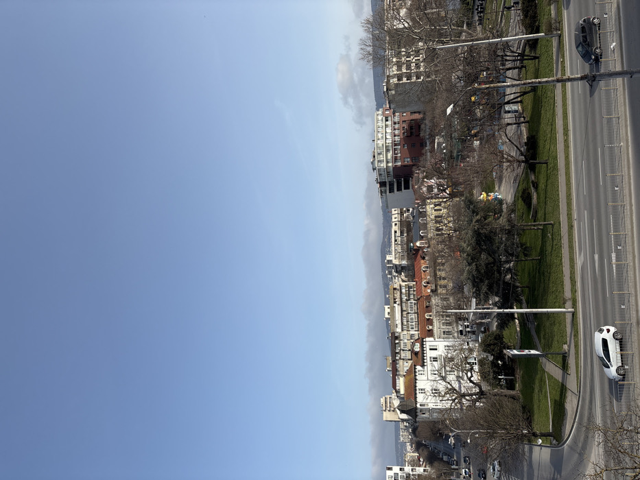 An elevated, wide-angle view captures a segment of central Varna, Bulgaria, specifically an area encompassing a major road intersection and an urban park. The sky is predominantly clear and bright blue, with a band of hazy white clouds visible low on the distant horizon above hills. In the foreground, a multi-lane asphalt road spans horizontally across the lower portion of the image. White lane markings are visible. A white hatchback vehicle is moving from left to right on this road. Further right, a dark gray hatchback is partially visible, either parked or slowly moving, near a tall, dark streetlamp pole. A low white metal fence lines the road's edge. The midground features a large, irregularly shaped green park island, covered in grass and populated by numerous trees. Most trees are deciduous and bare, indicating a non-summer season, though some evergreen conifers are present. Paved pedestrian paths weave through the park. On the right side of the park, a colorful children's play structure with yellow, blue, and red components is discernible. Another tall streetlamp pole stands within the park on the right, and a smaller pole with a sign is on the left. A secondary road curves around the left side of this park island, leading uphill. The background is dominated by the cityscape of Varna. A prominent white, multi-story building with a distinctive dark, multi-gabled roof and a conical turret feature stands behind the park on the left. Beyond this, a dense arrangement of varied architectural styles includes older, classical buildings with red-tiled roofs and newer, multi-story apartment complexes in shades of white, red-brown, and gray. Distant, undulating hills form the furthest horizon line. No individuals are clearly identifiable, and the scene appears to be under bright daylight conditions.