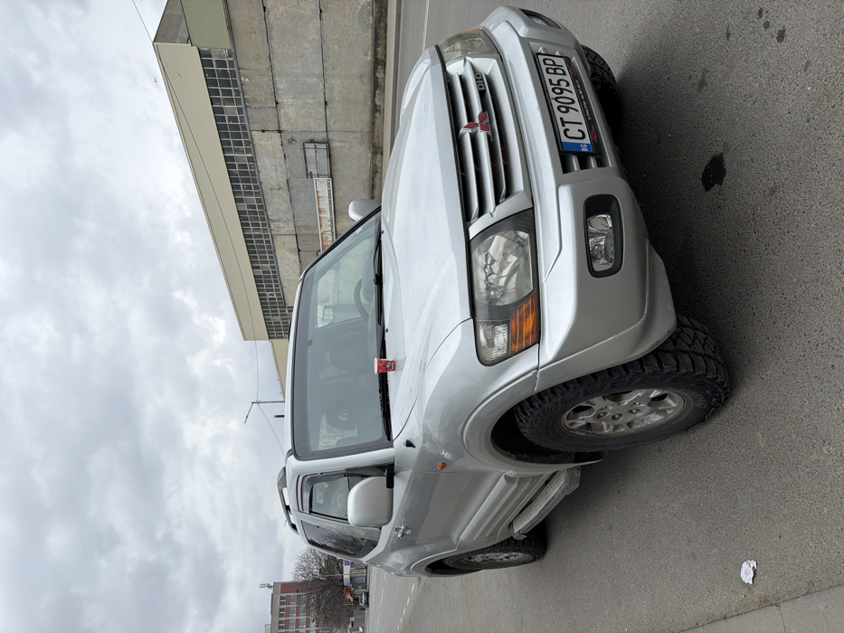 A silver, two-door Mitsubishi Pajero DiD SUV, bearing Bulgarian license plate CT 9095 BP (registered in Stara Zagora), is parked on the asphalt shoulder of a roadway