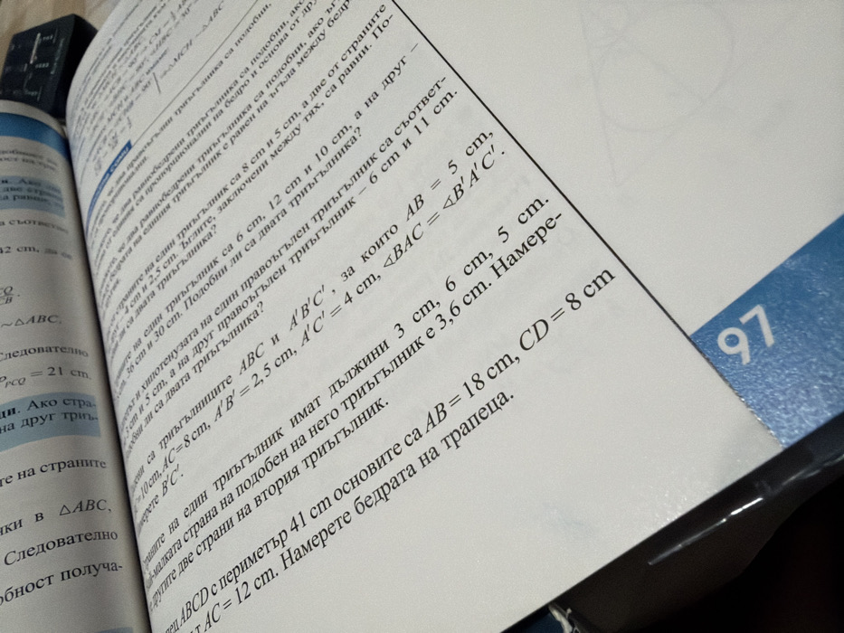 The scene is an indoor setting in Etropole, Bulgaria, featuring an open textbook resting on a dark, flat surface. The book displays white pages with black text, written in Bulgarian, detailing mathematical problems primarily related to geometry, including references to triangles and trapezoids with specified dimensions in centimeters. The number '97' is visible on a blue tab at the bottom right of the right page. A dark-colored remote control is partially visible in the upper right portion of the background. No individuals are present, and no actions are depicted.