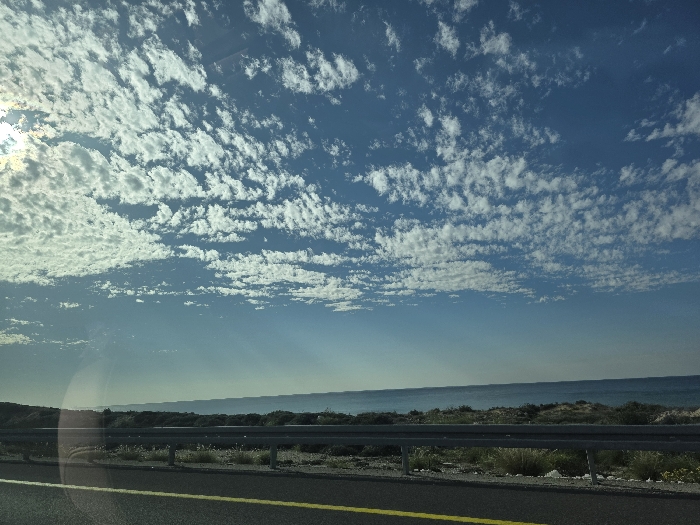 The image presents a wide-angle view of a coastal road scene within Hof HaCarmel Regional Council, Israel. The upper two-thirds of the frame are dominated by a blue sky populated with numerous scattered white altocumulus clouds, particularly dense on the left side where the sun is partially visible, causing a bright glare and lens flare in the upper left quadrant. Below the sky, a clear horizon line separates it from a calm body of blue-green water, indicative of the Mediterranean Sea, which spans from the mid-right to the far right of the image. In the foreground, a dark asphalt road surface is visible, marked with a double yellow line running centrally and a faint white line along its right edge. Parallel to the road, a silver-colored metal guardrail extends horizontally, positioned between the asphalt and a strip of natural coastal terrain. This narrow strip consists of sandy ground sparsely covered with low-lying green and yellow-brown shrubs and grasses, forming a buffer between the road and the sea. No individuals, vehicles, or identifiable man-made structures beyond the road infrastructure are present. The lighting suggests direct sunlight, indicating either early morning or late afternoon.