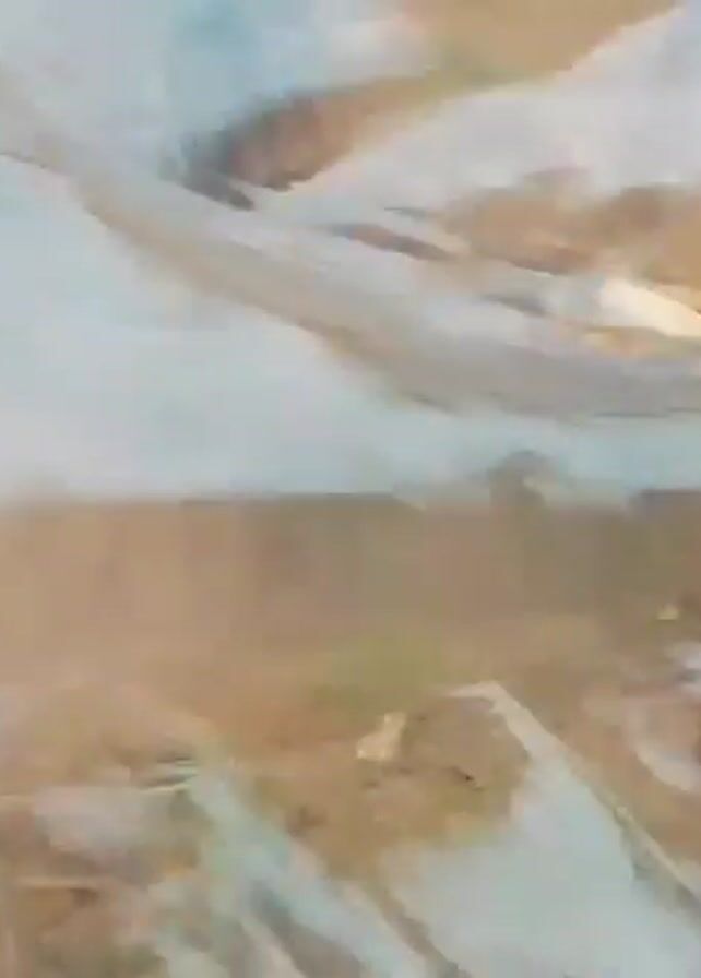 close-up view of shallow water flowing over a bed of sand and small rocks. The water is slightly murky, with reflections and ripples on the surface. Some leaves or small debris are visible on the bottom, being pushed along by the current. The light is filtered through the water, creating a soft, diffused illumination.