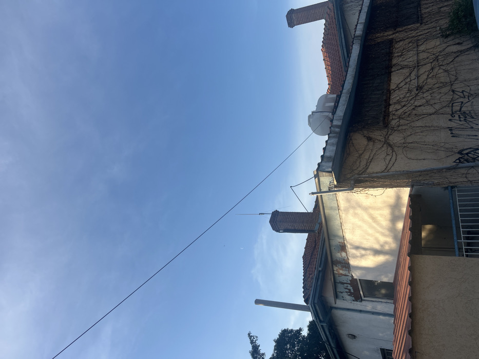 The image displays an exterior architectural scene in Limassol, Cyprus, under a clear blue sky with minimal scattered cirrus clouds. The lighting suggests either morning or late afternoon, with sunlight casting distinct shadows of foliage onto building surfaces. In the upper half, a thin, dark wire or cable traverses diagonally from the upper left to the lower right. The lower half features multiple building elements. On the far left, a segment of a dark green tree canopy is visible. Below it, a light-colored building wall is partially seen, above which a reddish-brown corrugated metal roof or awning extends. A light-colored metal railing is present in the bottom left corner. The central structure, positioned slightly left of center, is a multi-story building with a weathered, light-colored upper facade. This facade exhibits areas of peeling paint or surface deterioration, revealing a darker, possibly rusted, material underneath. A dark, rectangular window opening is visible. The building is capped with a traditional terracotta tiled roof. Two vertical structures rise from this roof: a tall, slender, dark grey metallic pipe (likely a vent or exhaust) on the left, and a robust, dark reddish-brown brick chimney centrally located. A slender, metallic rod, characteristic of a lightning rod, extends from the apex of the brick chimney. Light blue-grey rain gutters are visible along the eaves. To the right of the central building, a section of another building's wall is almost entirely covered by a network of dense, leafless vines. Below the vine coverage, dark, irregular markings or graffiti are visible on the wall. Above this wall, a flat roof section supports two prominent, white, cylindrical water tanks, consistent with solar water heaters or storage. Further right and slightly behind, another terracotta tiled roof is visible, from which a second, dark brick chimney emerges, appearing slightly angled. Utility lines or cables are observed connecting to a vertical support structure positioned between the central brick chimney and the flat roof. No individuals are present in the scene.