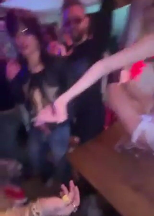 lively scene inside a bar or club. The focus is on a group of people dancing and partying. One person is sitting on a table, wearing a blonde wig and a white outfit. There are others dancing on the floor, many dressed in casual attire like jeans and patterned shirts. A person in a jacket with a star on it is visible. The lighting is dim and colorful, with red and purple hues. The atmosphere appears energetic and festive.