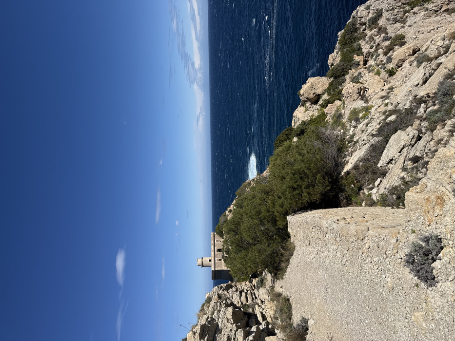 - "The image displays a coastal landscape in Sant Joan de Labritja, Spain, under a clear blue sky featuring minimal scattered white clouds" by FM-mrEnK2, licensed under CC BY 4.0