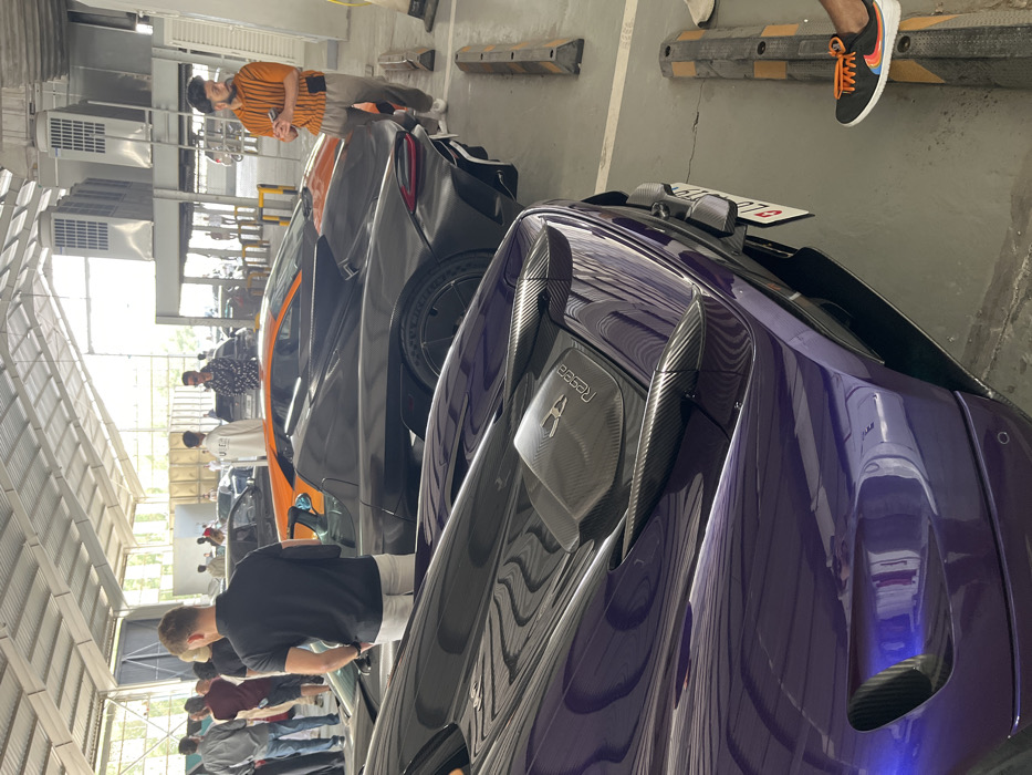 Inside a garage or showroom, a purple Koenigsegg Regera dominates the foreground. Its intricate carbon fiber detailing is visible. Behind it are several other luxury cars, partially obscured, with glimpses of orange and gray hues. A small group of people is observing the vehicles. Some are casually dressed, and one is wearing distinctive sneakers with orange accents. The lighting is bright, illuminating the rows of cars and the people milling around them.