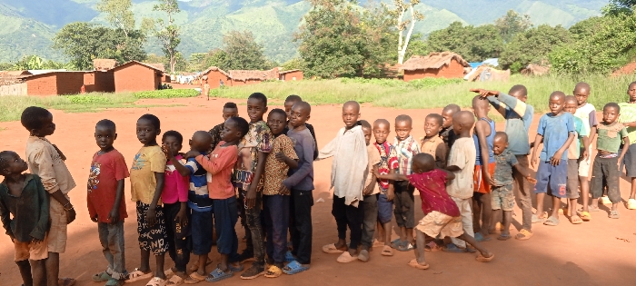 The image displays an outdoor scene in Ngalula, Democratic Republic of the Congo, featuring a group of approximately 25 to 30 children, predominantly boys, ranging in age from approximately 4 to 12 years