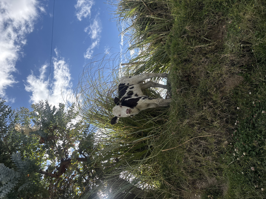 - "The image displays a single black and white calf standing on a grassy incline in Casco Urbano, Colombia" by FM-htt4C2, licensed under CC BY 4.0