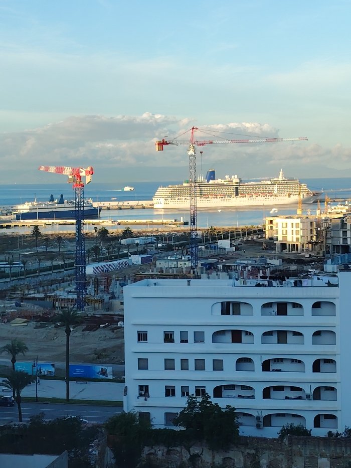 This elevated photograph depicts a detailed view of the harbor and an extensive urban development zone in Tangier, Morocco, under a clear, partly cloudy sky. The mid-ground is dominated by the harbor, where a large white multi-deck cruise ship with blue accents is docked at a pier. To its left, a dark blue and white ferry is also secured. A small white speedboat is observed generating a wake as it traverses the water between the two larger vessels. The foreground and mid-ground are defined by ongoing construction. Two prominent red and white tower cranes, featuring blue structural bases, stand within sites displaying excavated earth, concrete foundations, and partially erected building structures. Palm trees are sparsely distributed across these development areas and line a visible multi-lane road in the lower mid-ground, where one vehicle is discernible. A multi-story white building, characterized by both rectangular windows and arched balcony openings, occupies the lower right portion of the frame. Laundry is visible drying on its rooftop and from a second-story balcony. A single individual is partially discernible leaning out of a second-story window of this building. The scene is illuminated by direct sunlight, indicating daytime.