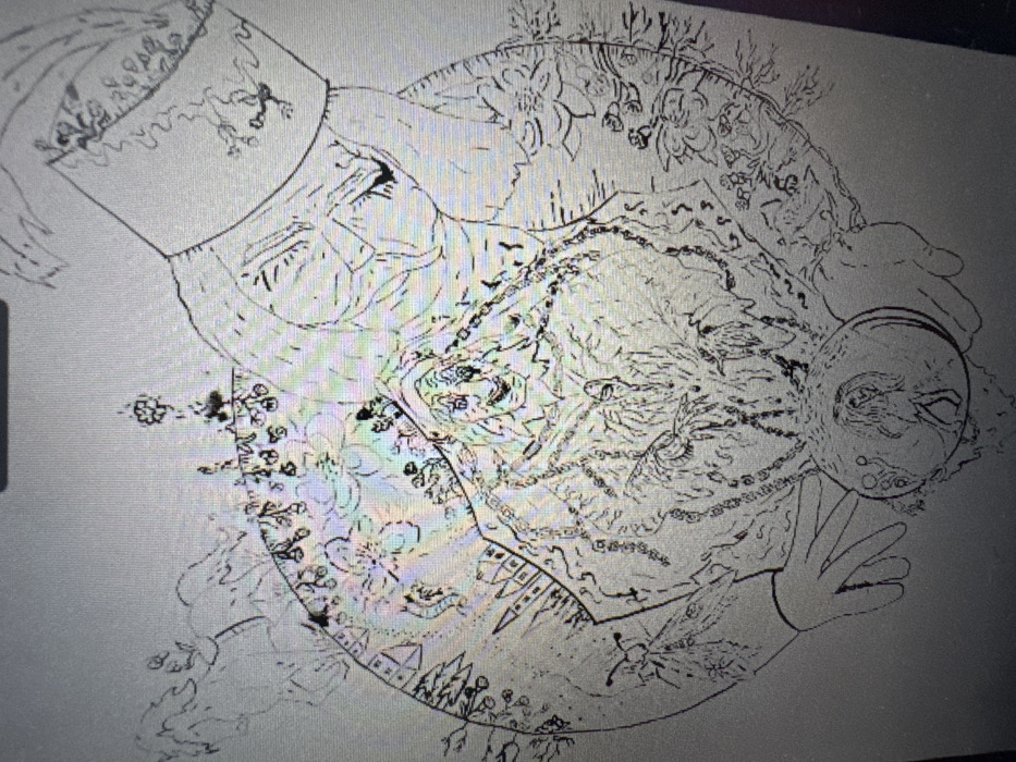 The image is a monochrome line drawing, possibly digital or a scan, exhibiting visual distortions typical of a photograph taken of a screen. The primary subject is a highly detailed, stylized depiction of an aged, smiling figure with a prominent nose and chin, wearing a hooded garment adorned with intricate patterns and chains. This figure's hands hold a spherical object, within which a smaller, standing human-like silhouette is visible. The central figure is encircled by a complex, decorative frame comprising various elements: botanical motifs including leaves and berry-like clusters, several small bird-like or mythical creatures, and architectural structures resembling castle turrets on the left side. A faint winged insect or moth is present in the lower-left section of the frame. Emerging from the upper right of the frame is a large, proportioned hand with an ornate cuff or sleeve, part of a larger, unseen figure, which appears to frame or interact with the central composition. The drawing is presented on a light-colored background, with black lines forming the imagery. The visual data does not depict a physical location within the city of Pernik, Bulgaria; rather, it is an artistic representation. The iridescent patterns observed are artifacts from the image capture process, likely indicating a screen display.