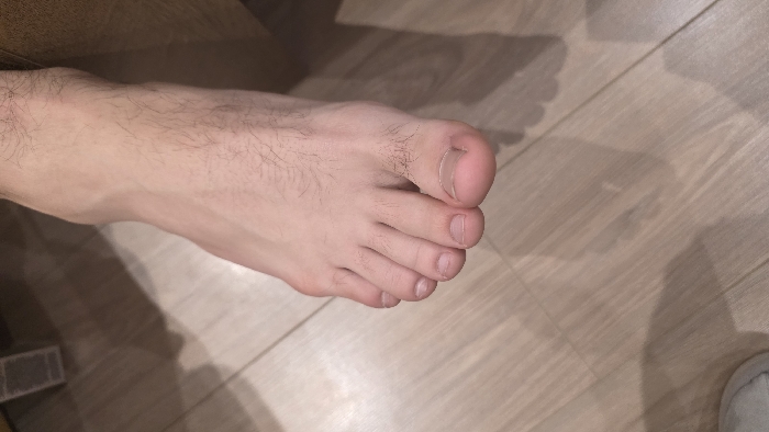 A close-up, downward-angled photograph captures a human left foot resting on a light-colored wooden or laminate floor in an interior setting in Unknown, Unknown