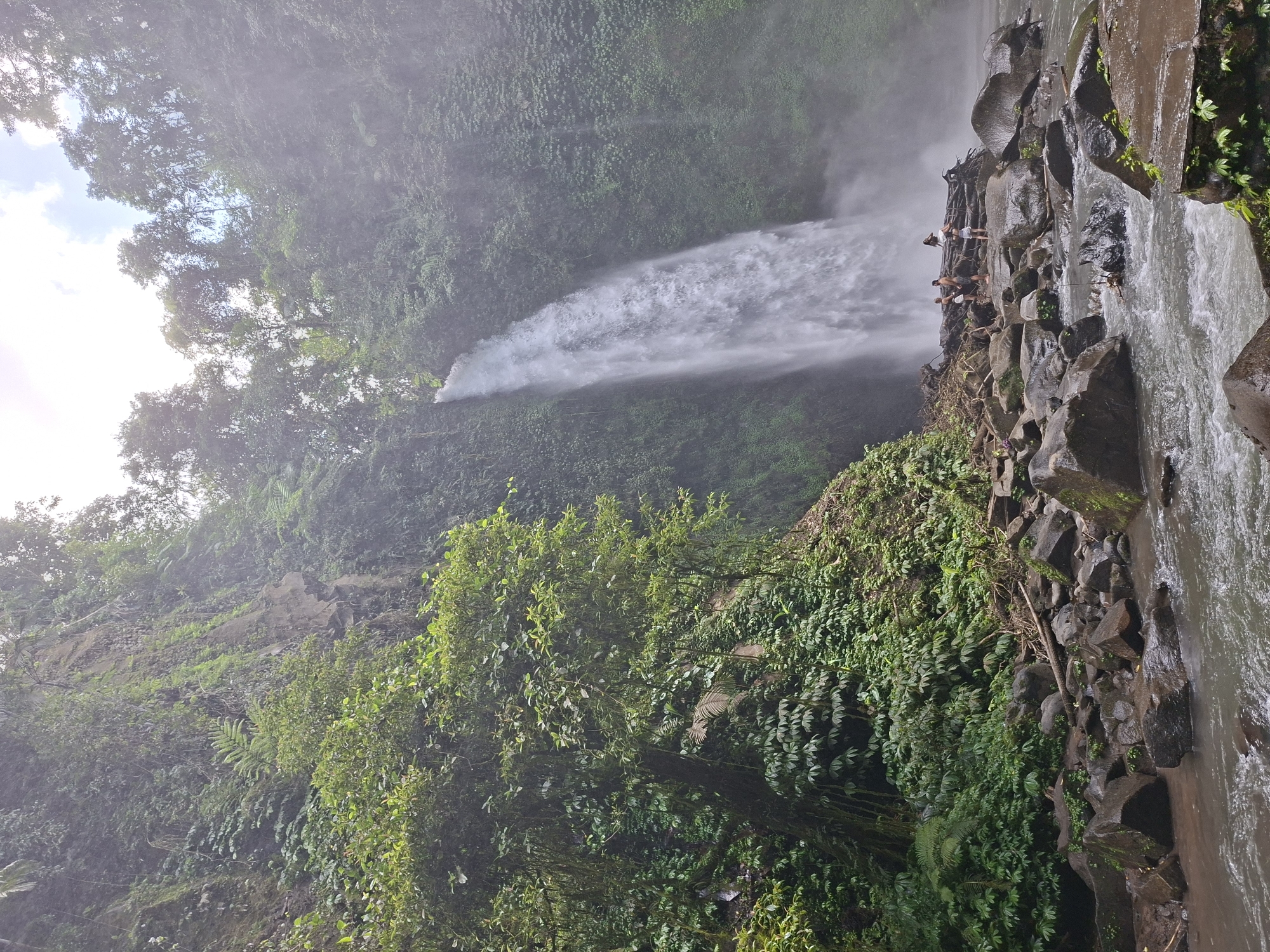 The image captures the Nungnung Waterfall located in the city of Petang, Indonesia. Lush green vegetation covers the surrounding terrain, with trees and plants prominent on both sides. A powerful stream of water cascades down from a height, creating a misty atmosphere. Several individuals are visible on the rocky outcrop near the waterfall's base, appearing to be observing or interacting with the scenery. A stream of water flows along the bottom edge of the frame.