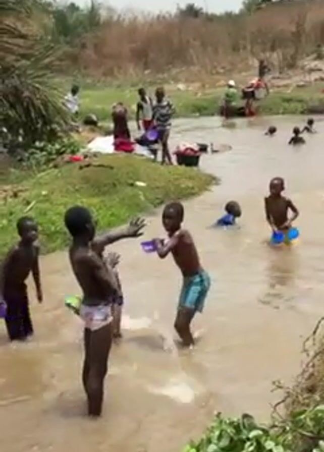 In an eye-level outdoor shot during daylight, a small group of young, dark-skinned children are seen wading and playing in a shallow, murky brown river. They are mostly shirtless, wearing various types of bottoms, including swimwear and underwear. Several children hold small, colorful plastic bowls or cups. They splash and interact with each other in the water, while in the background, other people are gathered by the river bank. Some appear to be doing laundry. The river is bordered by grassy banks with vegetation and a few trees. Some trash and clothing items are strewn along the bank. The overall setting suggests a rural or less developed area.