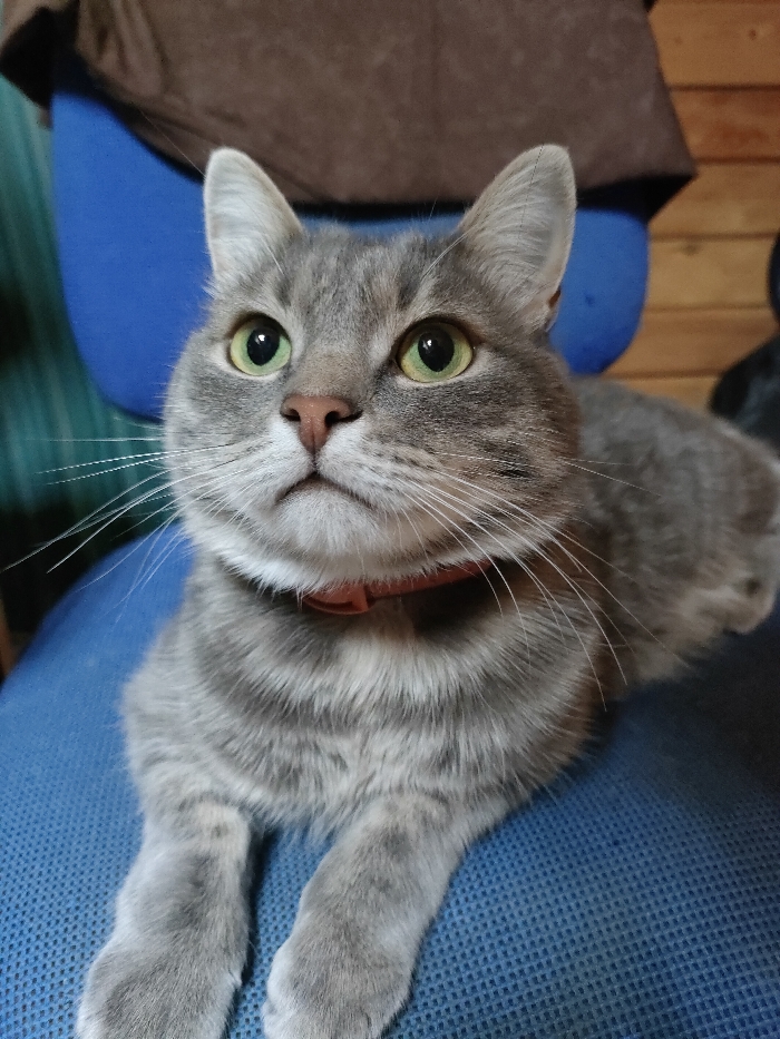 - "A grey tabby cat with green eyes and prominent white whiskers is captured in a medium close-up, situated on a textured blue surface, which appears to be the seat of an office chair" by FM-jApwm1, licensed under CC BY 4.0