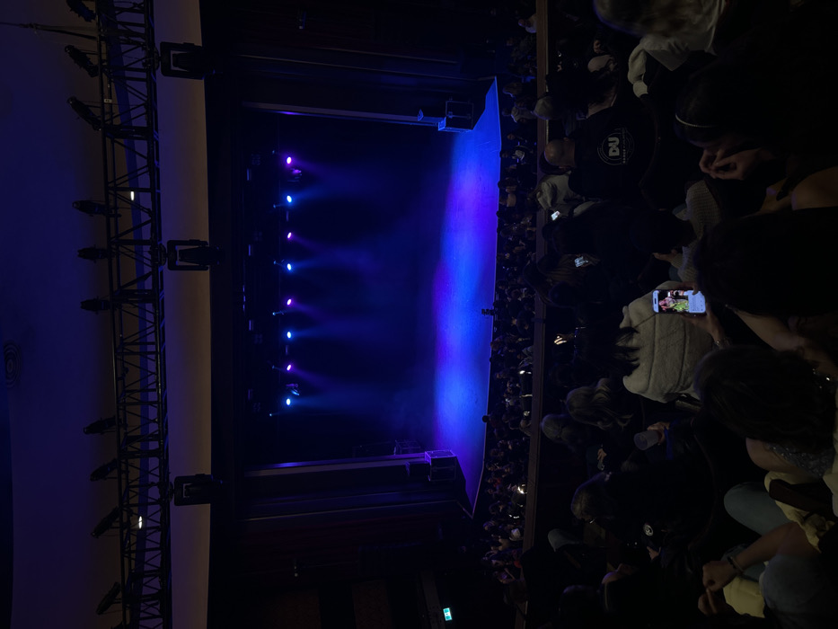 A tilted auditorium view displays a stage bathed in blue and purple lights, ready for a performance. A metal trussing system and stage curtains are visible. An audience fills the seats, some holding up phones, likely capturing the event. The photo's perspective offers an elevated look at the scene.