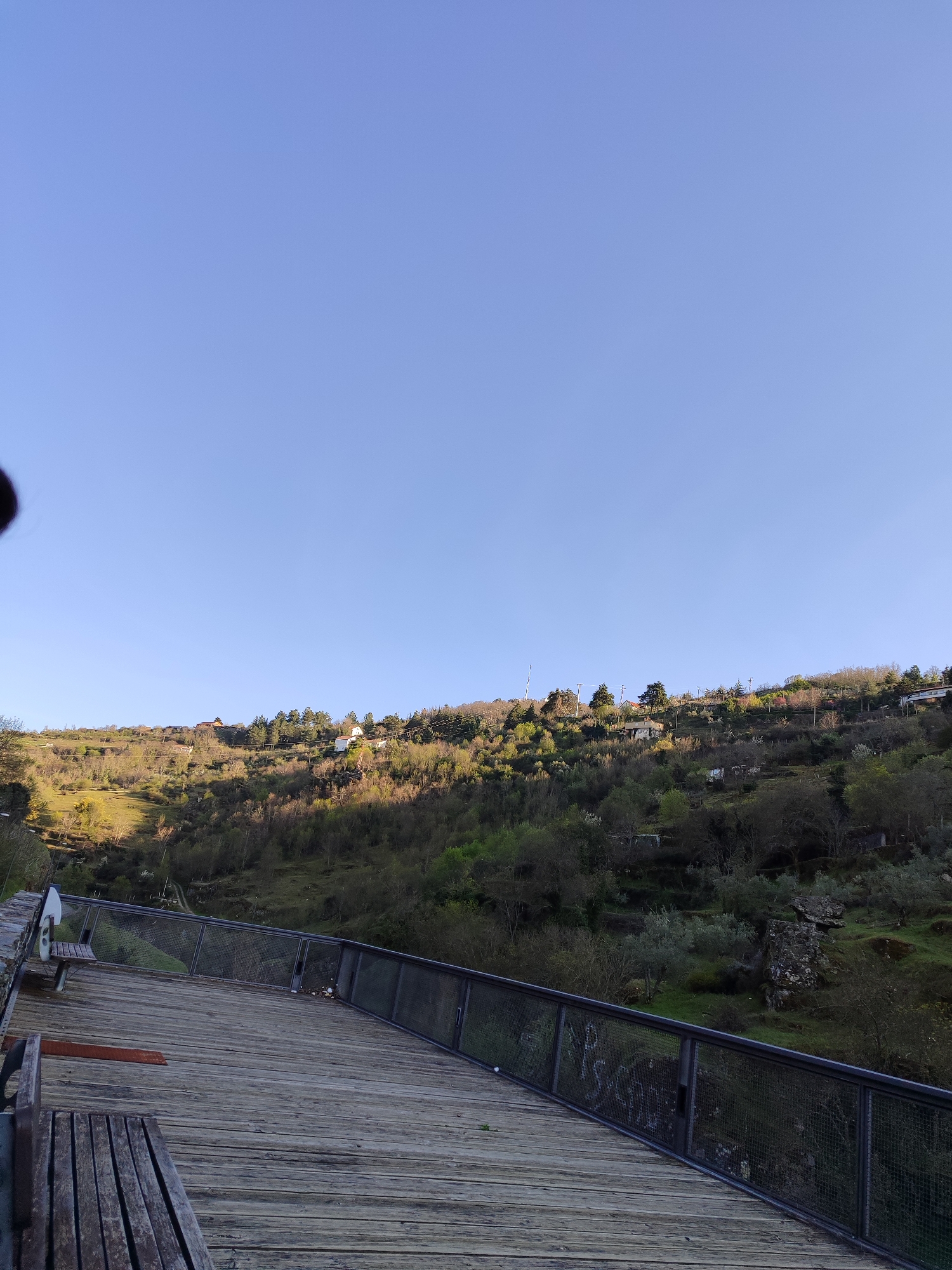 The image displays an elevated vantage point in Bragança, Portugal, under a clear, unclouded blue sky occupying the upper portion of the frame. In the foreground, a weathered wooden walkway, constructed from horizontal planks, extends diagonally from the lower left towards the mid-right. A dark metal railing, composed of vertical posts and wire mesh panels, defines the outer edge of the walkway. Indistinct graffiti, including characters resembling "Ps Cho," is present on the railing's mesh and support structures towards the right. A wooden park bench is partially visible in the lower left corner of the walkway, with another bench further along to the left. Scattered small debris is visible on the walkway near the railing on the right. Beyond the railing, a steep, tree-covered hillside descends into a valley. The vegetation consists of a mix of deciduous trees with nascent green foliage and some evergreen elements. Portions of the hillside are shadowed, while others are illuminated by direct sunlight. On the opposing hillside, numerous small, predominantly white residential buildings are interspersed among trees. Utility poles and power lines are visible traversing the hillside, and a communication tower stands on a distant crest near the center-right. No individuals, actions, or interactions are depicted. The scene is static, illuminated by what appears to be morning or late afternoon sunlight.