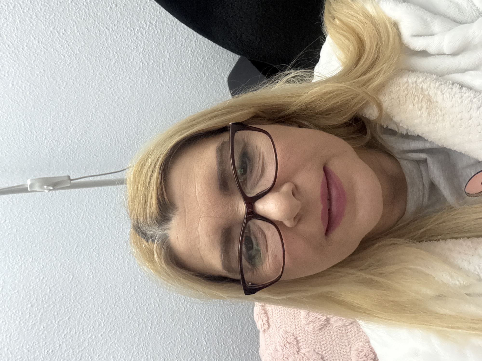 A selfie of a fair-skinned woman with blonde hair wearing glasses. She is indoors, possibly in a bedroom, based on the texture of the wall in the background. She is wearing a white, fluffy robe over what appears to be a gray shirt. The location is unknown.