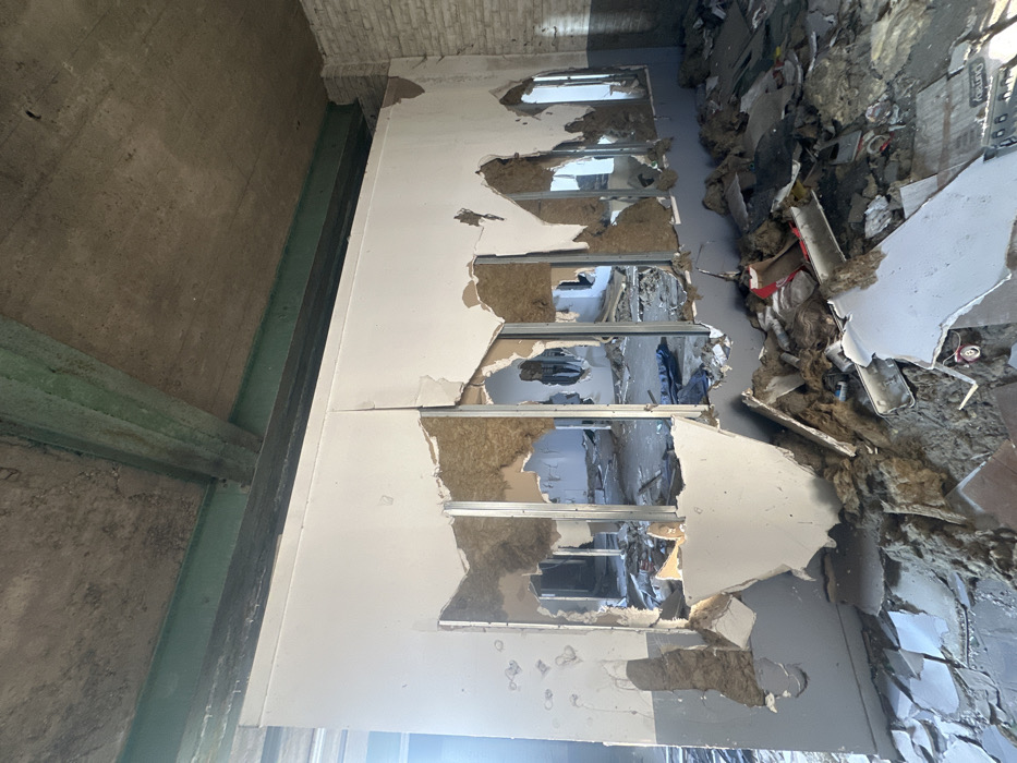 This image depicts the interior of a structure located in Carvin, France, appearing to be either an active demolition site or a building in severe disrepair. The central feature is a extensively damaged interior partition wall, which is largely comprised of torn white and grey drywall, exposing its internal structure of silver-colored metal studs and light brown fibrous insulation. Multiple irregular apertures pierce this wall, providing views into an adjacent room that also appears to be in disarray, with debris on its floor including a dark blue fabric item. The ceiling above is a rough, unpainted concrete slab, supported by visible, green-painted metal I-beams or girders running horizontally across the top of the frame. To the far right, a section of a light-colored brick wall is visible. The floor in the foreground is completely covered with a dense accumulation of construction waste, including shattered pieces of drywall, insulation, metal fragments, and various other debris. No individuals, actions, or direct interactions are present within the scene.