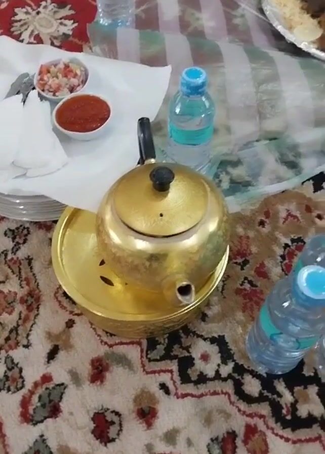 spread of food and drinks on a patterned carpet. There's a golden teapot on a matching tray, several bottles of water, a plate of food with rice and meat, small bowls of sauces, napkins, and a golden box. The camera pans around the setup, then focuses on a woman wearing a hijab and black dress, sitting on the carpet and holding a small book. She appears to be reading. The setting appears to be indoors, potentially a mosque or a large room with carpets and cushions along the walls.