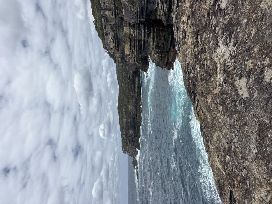 Jagged cliffs meet the ocean under a cloudy sky