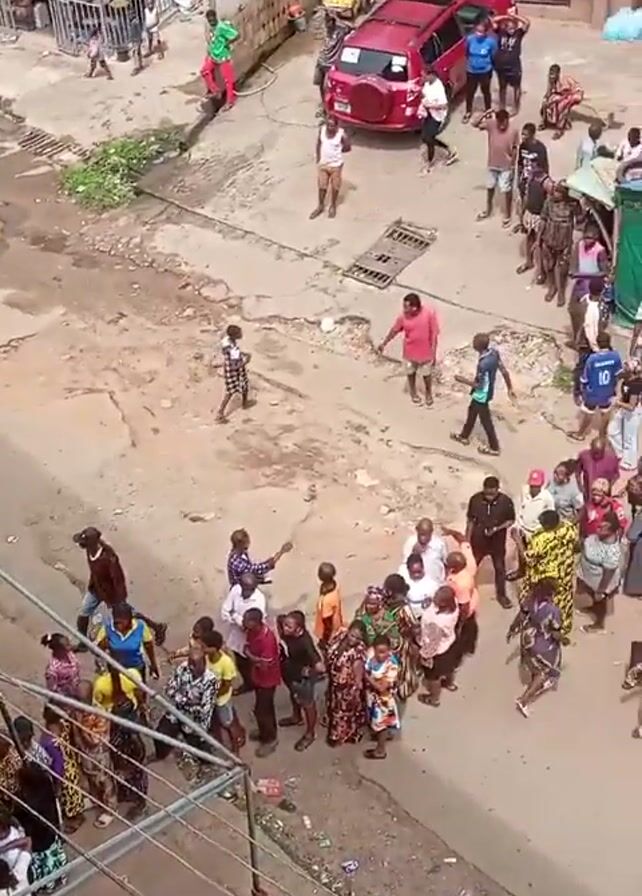 large group of people gathered in an outdoor area. The environment appears to be a street or public space in a residential or commercial neighborhood. The ground is uneven and shows signs of wear and tear. Many people are standing around, some are walking or moving about. Some individuals are wearing brightly colored clothing, while others have on more subdued attire. There is a red car parked nearby. The video is shot from an elevated perspective, possibly from a building overlooking the scene.