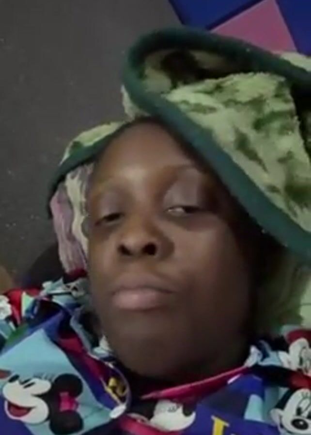 A person with dark skin and short, dark hair is lying down, looking directly at the camera. They are wearing a blue, cartoon-patterned pajama top, and a green towel is draped around their head. A patterned blanket is visible beneath their head. The background is a gray surface, and a blue and pink tiled wall is partially visible in the upper right corner.