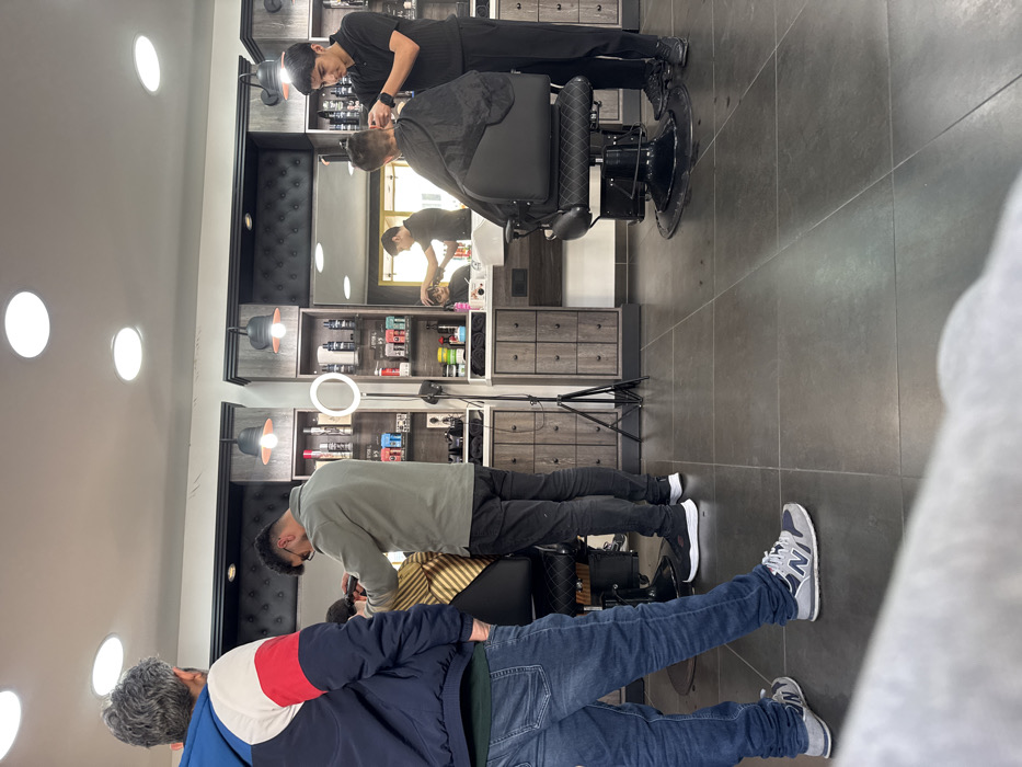 The scene depicts the interior of a barber shop in Krems an der Donau, Austria. The floor is covered with large, dark grey tiles. Four circular recessed lights are visible on the white ceiling, along with two dark-colored pendant lights positioned above barber stations. In the immediate foreground on the left, a male subject with grey hair, wearing a navy blue jacket with red and white accents, blue jeans, and grey New Balance sneakers, stands with his back partially towards the camera. Mid-ground left, a male barber with dark hair and glasses, dressed in a light olive-green collared shirt and black trousers, black sneakers, is actively cutting the hair of a seated client. The client, facing away from the camera, is draped in a yellow and brown striped barber cape. This station features a large mirror framed by dark wood-look cabinetry, with shelves displaying hair products. Mid-ground right, a second male barber with dark hair, wearing a black polo shirt and black trousers, black sneakers, is also cutting the hair of a seated client. This client, facing away, is draped in a black barber cape. This station mirrors the one on the left, with a large mirror and dark wood-look cabinetry displaying products. A white ring light on a black tripod stands between the two main barber stations. In the reflection of the mirror behind the right barber, a third male barber, wearing a dark shirt, is visible cutting the hair of a younger client (child) whose face is reflected. The overall environment suggests a modern, functional barbershop setup.