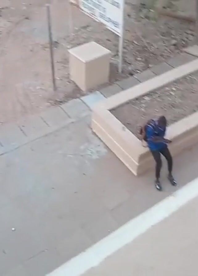 n overhead view of an outdoor area. Initially, a man in a blue shirt, black pants, and a backpack is sitting on the edge of a low, rectangular planter, looking at his phone. The camera then pans to a wider view of a dirt-covered area with sparse vegetation. Several individuals are seen walking across the space. Some are wearing light-colored, traditional garments, while others wear blue outfits. A building with a red brick facade and light-colored trim is visible on the right side of the frame, along with a sign that reads "ABDULLAHI TAFUNA BALERA UNIVERSITY OF SCIENCE AND TECHNOLOGY DIRECTORATE OF HUMAN RESOURCE DEGKLOK". A water tank on a wooden stand is also visible. A road is seen in the distance with more people walking on it.