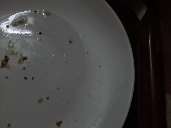 - "An overhead shot shows a mostly empty, white plate with food remnants scattered" by FM-9VsWL2, licensed under CC BY 4.0