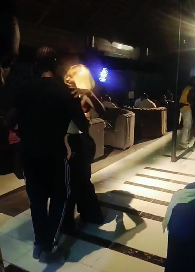 couple dancing in what appears to be a bar or lounge setting. The man is wearing a black shirt and black Adidas track pants. The woman has blonde hair and is wearing a white top and dark pants with what looks like sequins. They are dancing close together. Other people are visible in the background, sitting on sofas and chairs. The lighting is dim, with various colored lights around the room. The floor has a patterned tile design.