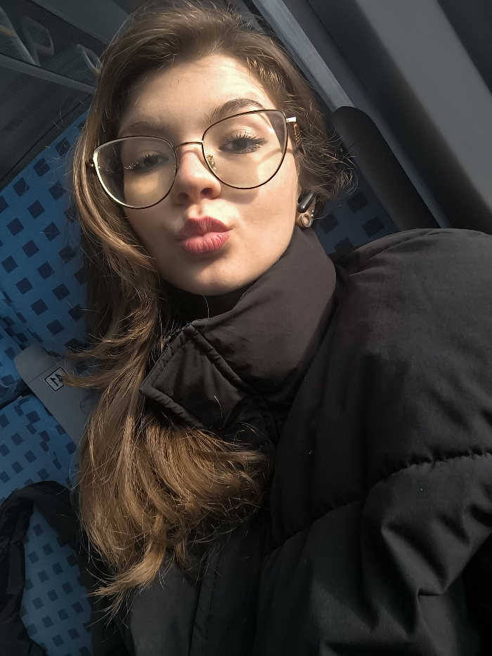 The image displays a close-up portrait of a female individual captured within a passenger vehicle, situated in the city of Kopanitsa, Bulgaria. The subject has light skin, long light-brown hair, and wears gold-framed cat-eye glasses, which exhibit reflections. Her lips are pursed, and she wears a black puffer jacket with a high collar over a dark garment. A black earbud is visible in her right ear. The background consists of blue fabric seats with a subtle lighter blue checkered pattern, indicative of public transport. A dark, rectangular window or panel is visible behind the subject's right side, and a light-colored object with a dark marking is partially visible on the seat to her lower left. Strong natural light illuminates the subject from the left.
