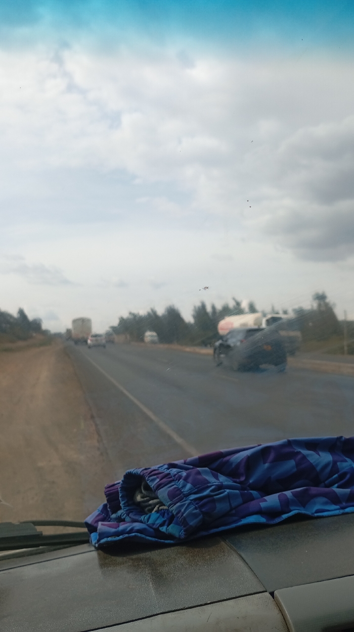 A highway scene captured from a vehicle's interior. A pair of blue and purple plaid pants sit on the dashboard. Outside, a multi-lane highway stretches into the distance under a cloudy sky. Traffic includes a large truck, a tanker truck, and a dark car in the right lane. Trees line the sides of the road. The image is slightly blurred, suggesting movement or imperfections on the windshield.