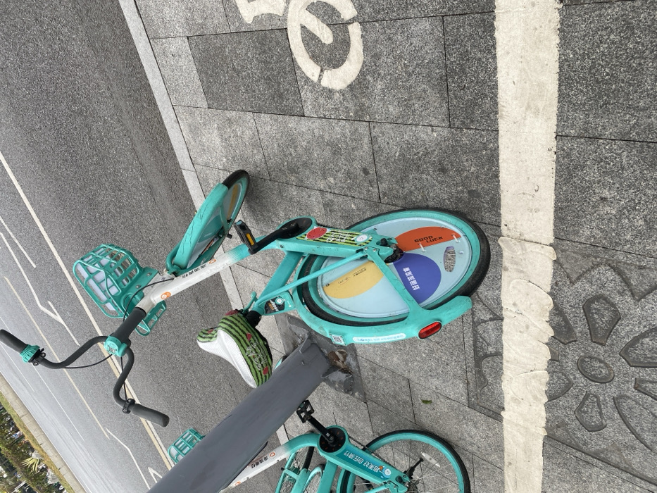 Two turquoise rental bicycles rest on a gray, patterned pavement. One bike, with a basket and a watermelon-patterned seat, faces towards a road. The rear wheel displays a colorful design with the words "GOOD LUCK". The other bike is partially obscured by a gray object. A painted bike lane symbol is visible on the pavement near the first bicycle. The scene appears to be outdoors.