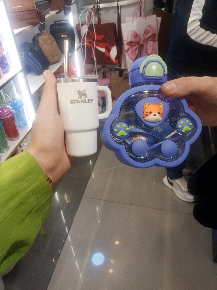 hands of two individuals in an indoor retail environment within the city of Unknown, Unknown. On the left, a hand wearing a green sleeve holds a white, tall, double-walled Stanley brand mug with a silver metal straw protruding from its lid. On the right, a hand holds a blue, paw-shaped children's water bottle featuring a central cartoon fox or cat face and green paw print accents. The person holding the blue bottle is partially visible, wearing blue jeans and white Nike sneakers with a black swoosh. The background displays merchandise shelves containing various handbags in colors such as brown, black, and blue, along with an assortment of colorful plastic bottles and cups. Further back, red and pink gift bags with bows are seen hanging. The floor is a polished, light grey tiled surface reflecting overhead lighting.
