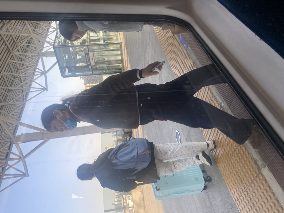 The scene depicts an elevated metro station platform at Daliang Station in Shunde District, China, viewed from inside a train. Daylight illuminates the platform and the distant urban skyline under a clear sky. Three individuals are present on the platform. In the mid-ground, an adult subject walks from left to right, wearing a brown jacket, dark trousers, and a light blue surgical mask positioned below the chin. This individual has dark hair styled in a ponytail and holds a silver smartphone in the right hand. Behind and to the left of the first subject, a second individual walks away from the camera, pulling a light blue four-wheeled hard-shell suitcase with their left hand. This subject wears a dark jacket, light-colored pants with a subtle pattern, and light-colored sneakers. A light blue backpack is worn on their back. To the far right, partially obscured by the train window frame, a third individual, wearing a light-colored jacket, is visible, appearing stationary. The platform surface features yellow tactile paving strips along the track edge. A multi-story, clear glass elevator structure, displaying Chinese characters identifying "Daliang Station," stands on the platform. Above the platform, a white, open-truss metal canopy structure provides overhead shelter. The background reveals a cityscape comprising numerous high-rise buildings.