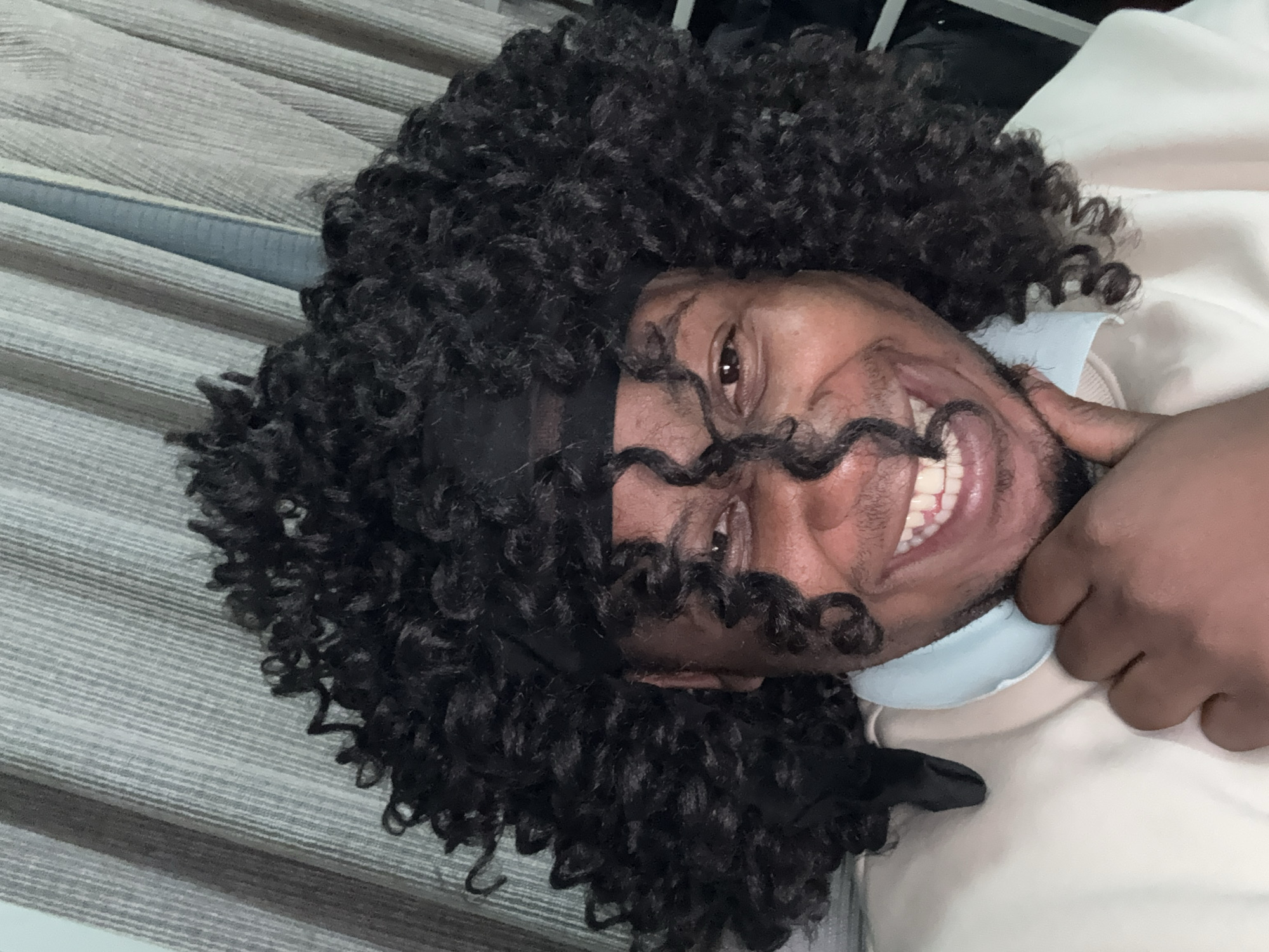 A man with dark curly hair and a black headband is smiling. He is wearing a light-colored top, and a light blue object is visible near his neck. He appears to be lying down, with a striped surface behind him. The location is not discernible from the provided image.