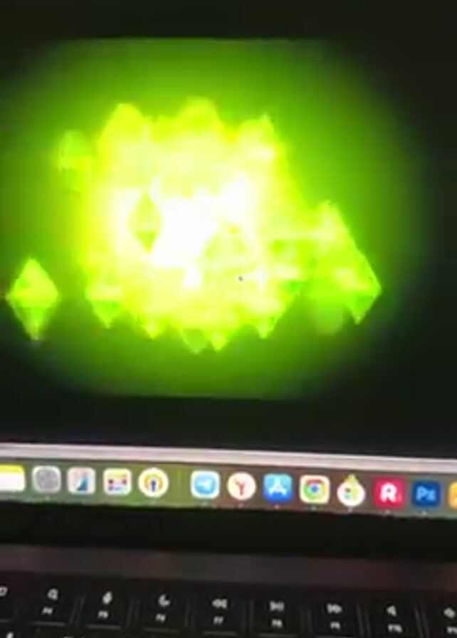 A laptop computer screen displays the loading screen for the video game "The Sims 3." Initially, several glowing green diamond shapes appear on a black background, then coalesce into one larger diamond with the number "3" displayed above it. The title "The Sims 3" then appears. Below the screen, the laptop keyboard is visible. Background sounds include children's voices.