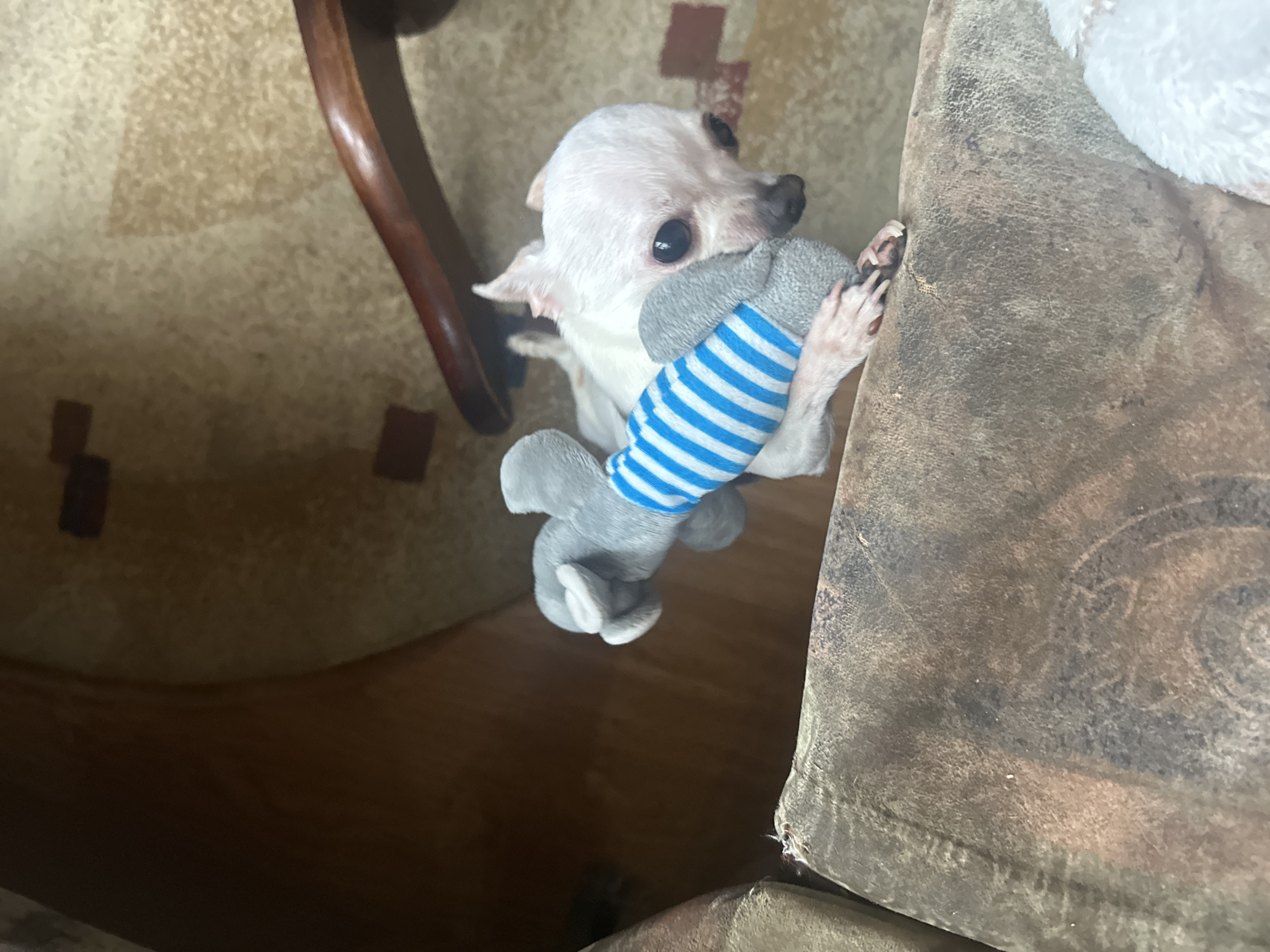 A small, white chihuahua is holding a gray plush toy with blue and white stripes in its mouth and paws. The dog is indoors, standing near a dark, worn upholstered item, potentially furniture. Part of a wooden chair leg and a beige carpet are visible in the background. The location in Sliven, Bulgaria is not discernible from the image.