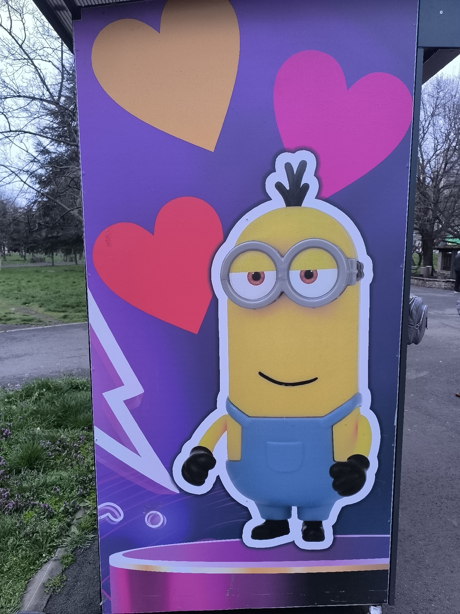 poster on the side of a bus stop or information kiosk. The poster features a Minion character with yellow skin, one eye, overalls, and a single strand of hair. Above the Minion are heart shapes in yellow, red, and pink. The background is purple with white graphic elements resembling lightning bolts and sound wave icons. The structure the poster is attached to appears to be metal and possibly mobile, given a glimpse of a wheel on the lower right. The location is Burgas, Bulgaria, indicated by the presence of the Minion character, as there was a series of public art installations featuring Minions placed around the city. The surroundings are a park-like setting with trees and grass, suggesting an urban park environment. The photo was taken during daylight hours, with overcast conditions. There is a blurry figure in the background, possibly a pedestrian.