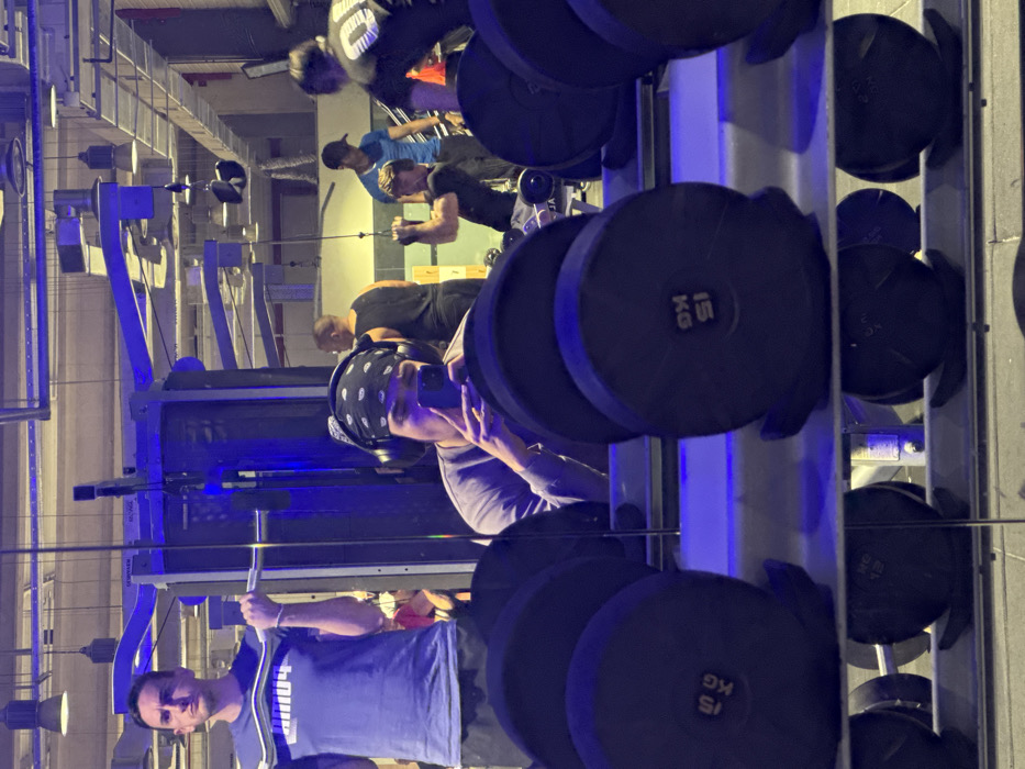 A gym scene shows a man with a blue shirt and a weight bar in hand, possibly taking a selfie in the mirror