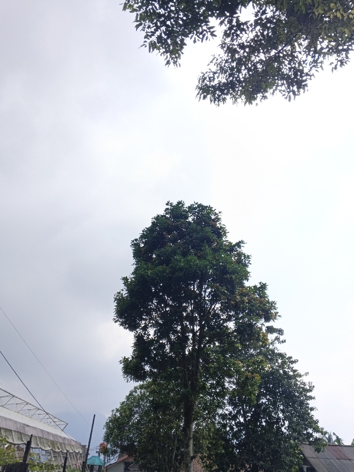 The image depicts an outdoor scene in Na Sangkham, Laos, under an overcast sky. A tall, dense-canopied tree with dark green foliage dominates the central and right portions of the frame, extending upwards. Branches from additional trees with similar dark green leaves are visible in the upper left and upper right corners, silhouetted against the light grey sky. In the lower left quadrant, a large structure consistent with a greenhouse is visible, featuring a light-colored, possibly translucent, roof with a visible metal framework. A thin, dark utility wire runs diagonally across the mid-left, passing in front of the greenhouse structure. Towards the bottom center-right, behind the main tree, parts of residential buildings are discernible, including a reddish-brown tiled roof and a small structure with a blue top, possibly a water tank, next to a dark vertical pole. No individuals are present, and no actions or interactions are depicted. The environment appears semi-urban or rural.