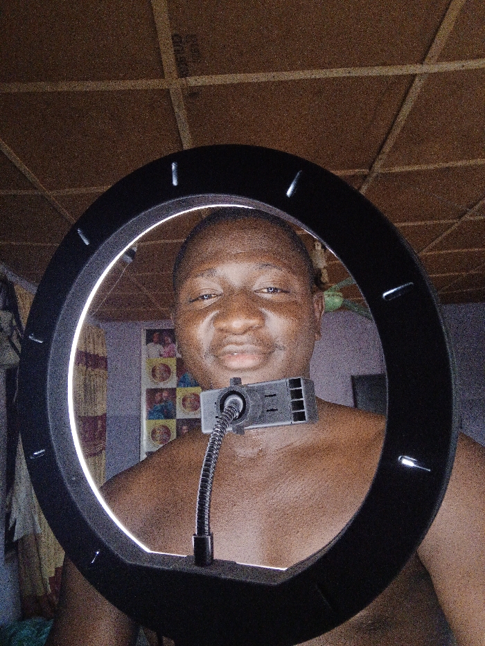 An adult male, dark-skinned, is depicted in an indoor setting in Akwanga, Nigeria. He is positioned centrally, facing forward, with his head and upper torso framed by a large, illuminated black ring light. The man is shirtless, maintaining a neutral facial expression with a slight upturn at the corners of his lips, and appears to be looking directly at the camera lens. A flexible gooseneck arm extends from the bottom interior of the ring light, holding a dark gray rectangular device, likely a smartphone holder or small camera, in front of the man's chest. The background includes a ceiling constructed of light brown fiberboard or plywood panels with visible structural beams. Behind the subject, a wall displays multiple framed images or portraits arranged in a grid. A blurred green object is partially visible in the background, positioned to the viewer's left of the subject's head. The scene is primarily illuminated by the ring light, and the image exhibits a grainy texture.