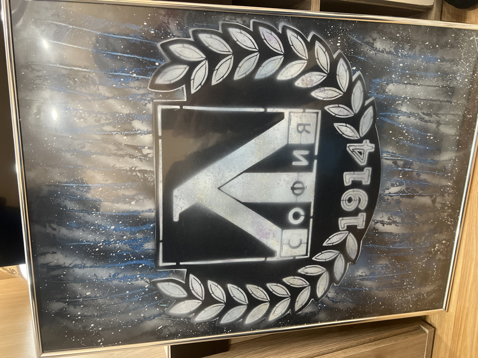 A rectangular framed artwork is depicted leaning against a light brown wooden surface, likely part of a cabinet or shelving unit, in an indoor environment in Draginovo, Bulgaria. The artwork features a thin, silver-colored metallic frame enclosing a dark background, primarily black, with vertical streaks of blue and scattered white speckles, characteristic of spray paint or a distressed finish. A prominent emblem, rendered in light grey or silver, occupies the central area. This emblem consists of a stylized, triangular character, resembling the Cyrillic letter 'Л', enclosed within a rectangular border. Below this character, the Cyrillic word 'СОФИЯ' (SOFIA) is stenciled within the same rectangular frame. The entire rectangular emblem is encircled by a laurel wreath design composed of two curved, leafy branches. Below the wreath, the numbers '1914' are stenciled. No individuals, actions, or interactions are visible within the frame.