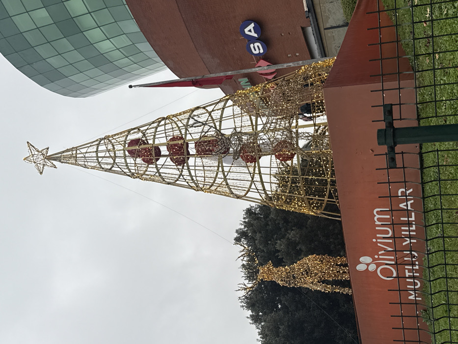 A holiday scene depicts a stylized Christmas tree made of a wireframe adorned with lights and ornaments. A luminous reindeer stands nearby, further enhancing the festive atmosphere. The scene is set near a building with a sign for "SA," and a brown sign with "Olivium MUTLU YILLAR" is prominent. A dark green fence frames the scene. The sky appears overcast, providing a soft, diffuse light.