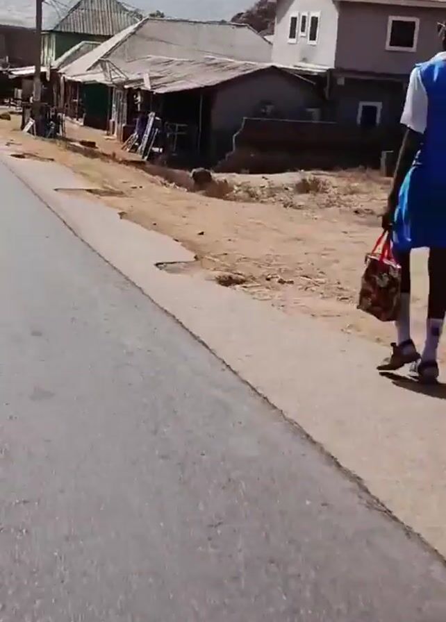 low-angle view of a street in a rural setting. The camera appears to be mounted on a moving vehicle. Initially, a person in a blue and white uniform walks down the road carrying a red bag. The camera then moves past and away from the individual, showcasing a line of people, possibly students, also in blue uniforms, walking in the same direction. On the right side of the road, there are several buildings, some with metal roofs, and commercial fronts with merchandise displayed. The road is paved but has areas of dirt and disrepair on the sides. In the background, a hazy hill or mountain is visible. The video is shot in daylight.