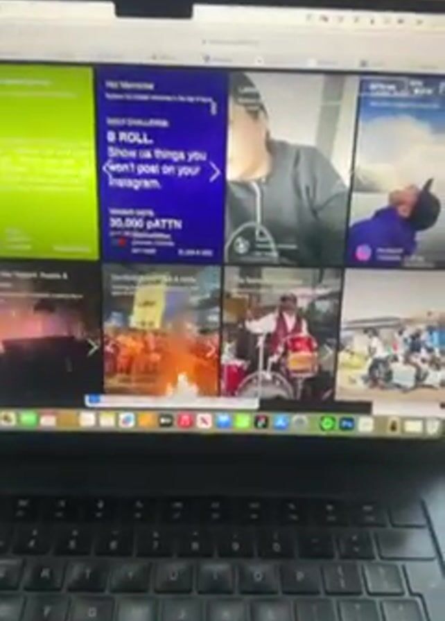 A person is looking at a laptop screen showing a website with a variety of video thumbnails on the top half and a black screen with lines of text underneath
